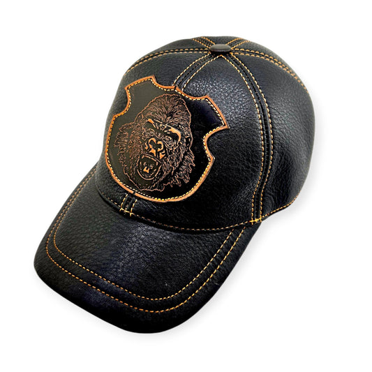 Leather Biker Hat: Handmade Black Motorcycle Cap for Men with Roaring Gorilla Patch, Military Baseball Style Leather Hat | Apero Bullo