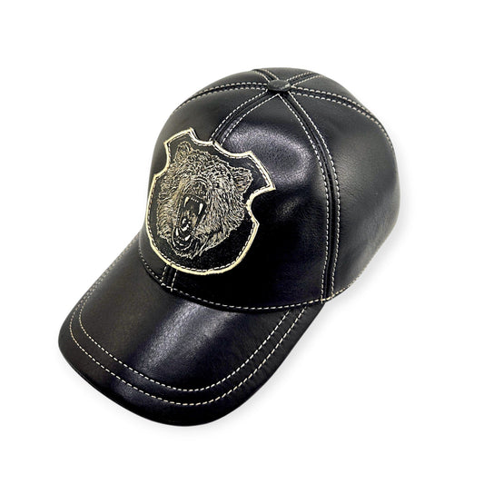 Leather Biker Hat: Handmade Black Hunting Cap for Men with Roaring Grizzly Bear Patch, Military Baseball Style | Apero Bullo