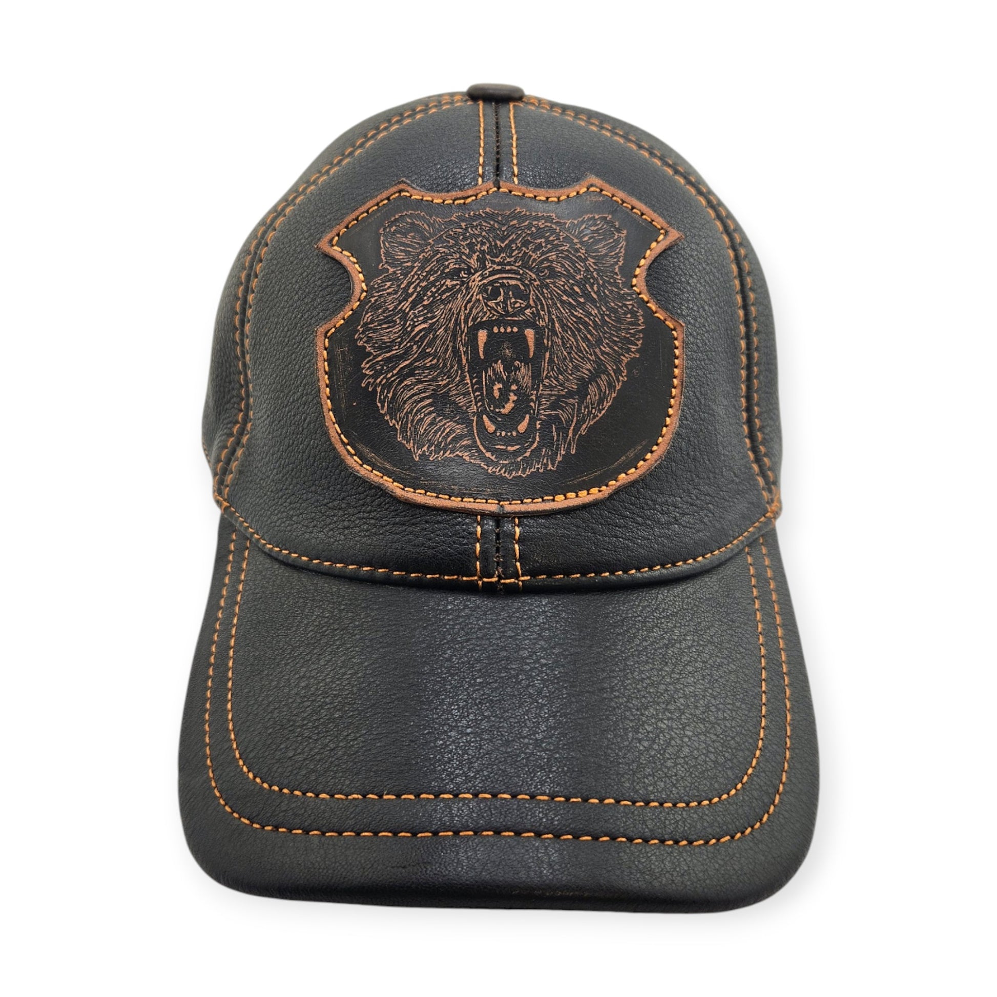 Leather Hat: Handmade Black Biker & Hunting Cap with Grizzly Bear Patch, Vintage Style for Men | Apero Bullo