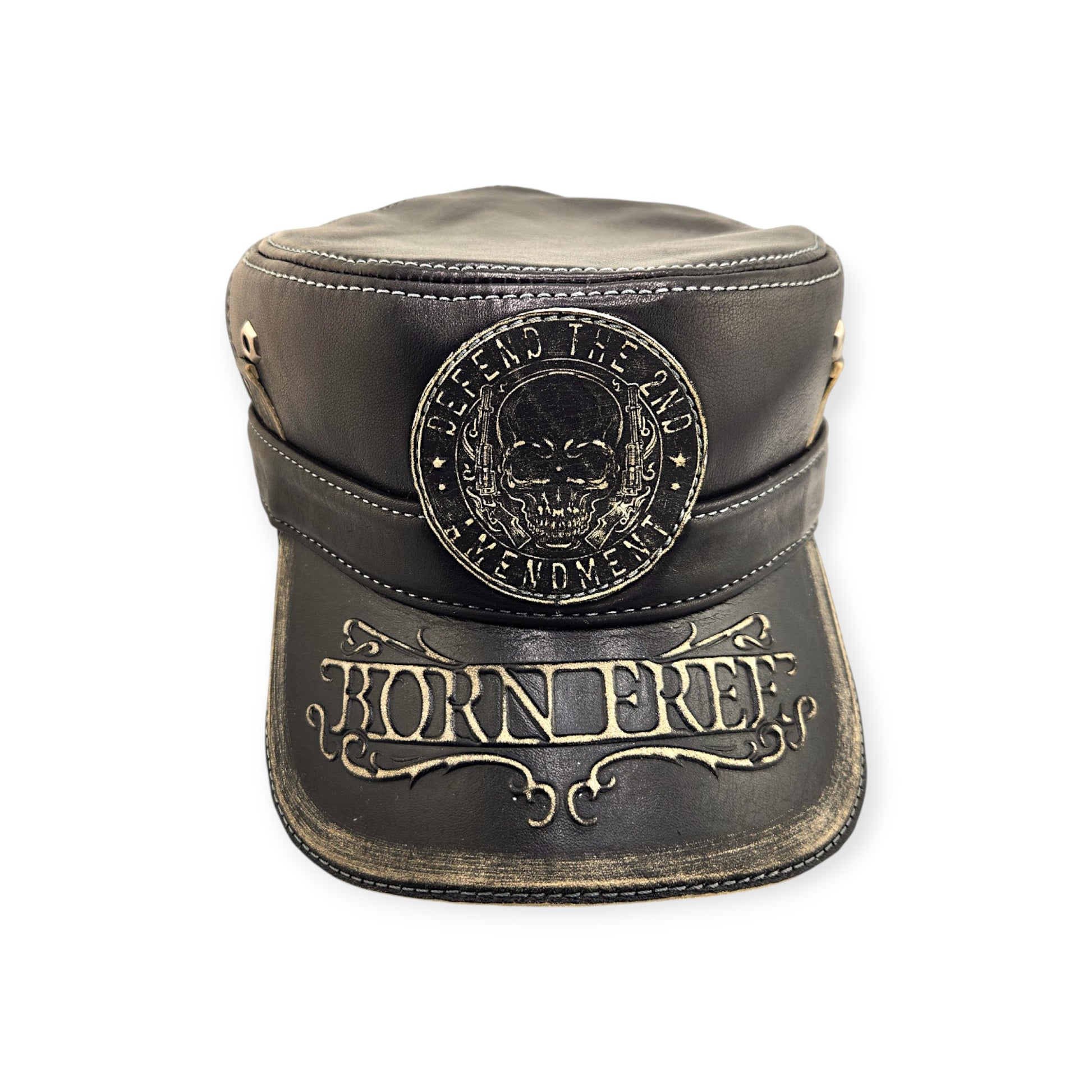 Leather Biker Hat: Handmade Black Motorcycle Cap with Skull Patch, Born Free Brim Engraving, 2nd Amendment Design | Apero Bullo