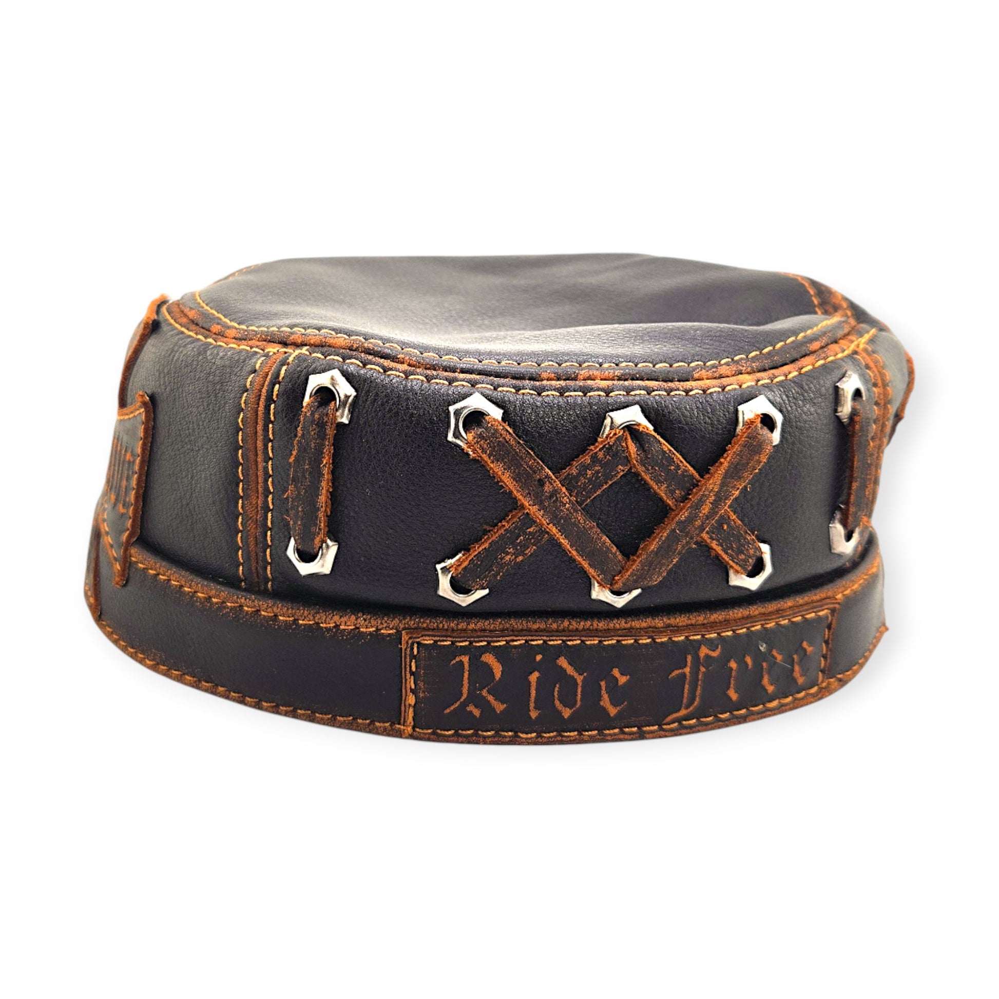 With its burnished contrast stitching, cotton lining, and adjustable strap, this hat is made for comfort and long-lasting wear — whether on the road, at rallies, or as part of everyday outlaw fashion.