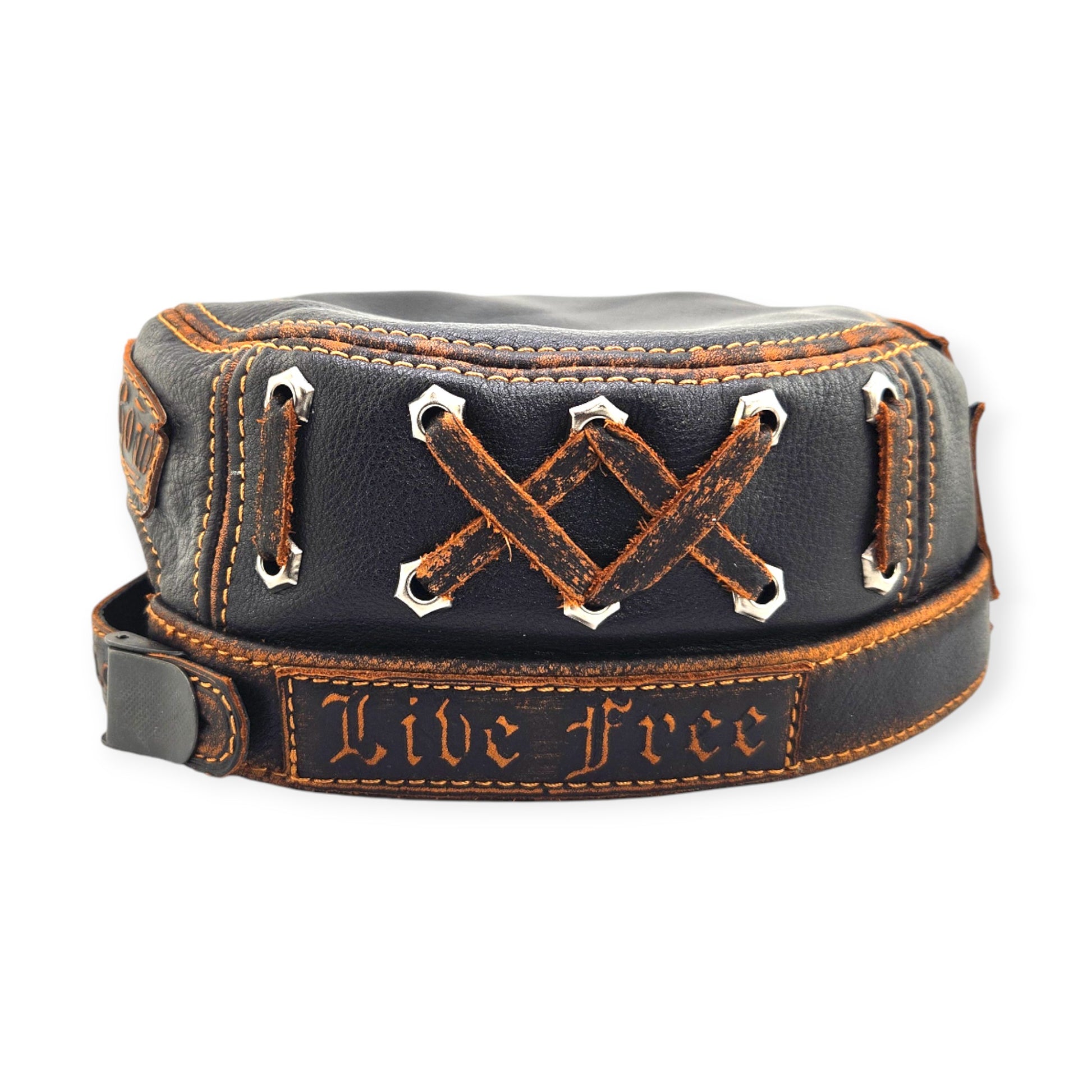 The front showcases a bold Iron Cross patch with “Live to Ride, Ride to Live”, while the sides feature distressed lace-up panels with metal eyelets. Across the band, embroidered messages like “Ride Free” and “King of the Road” add attitude and authenticity.