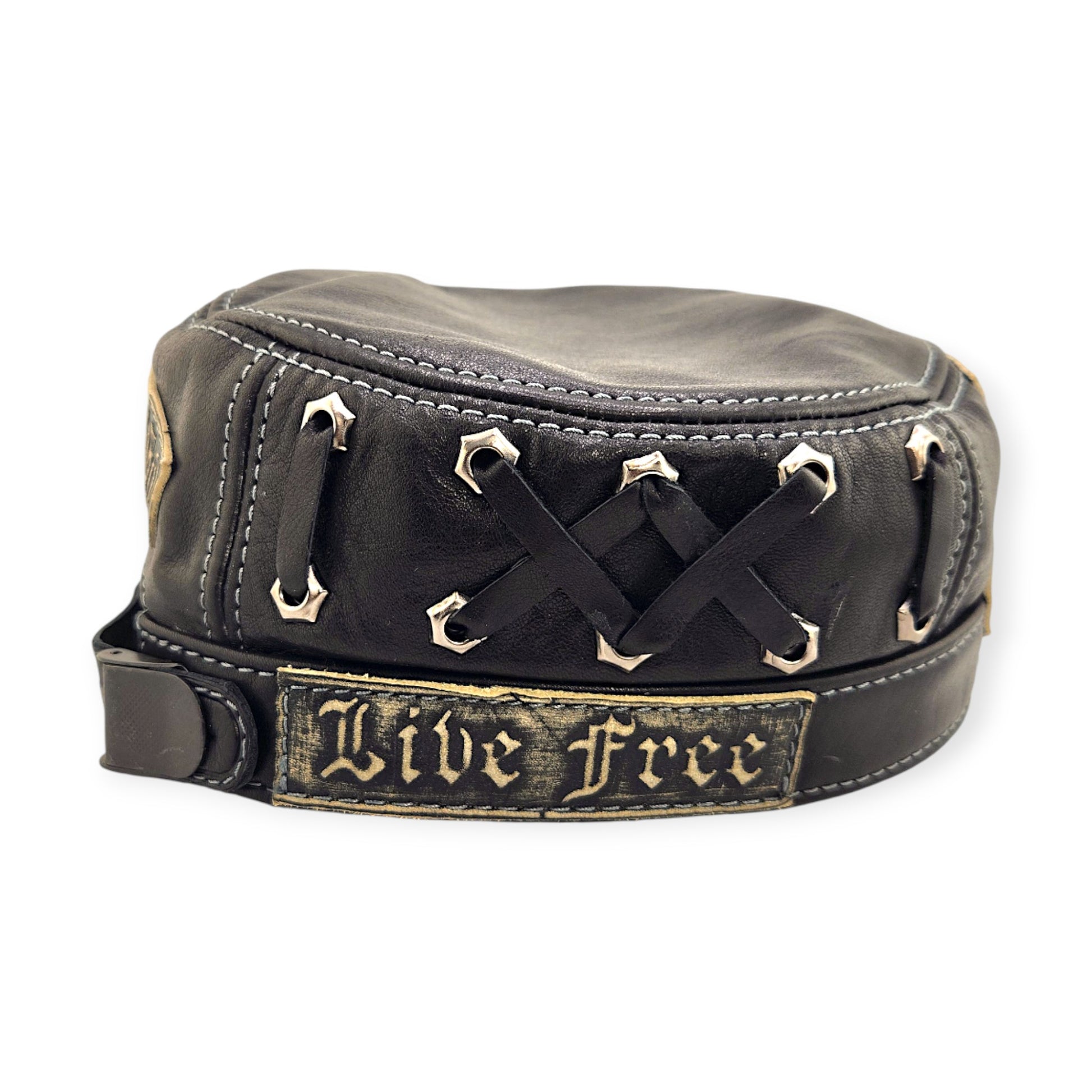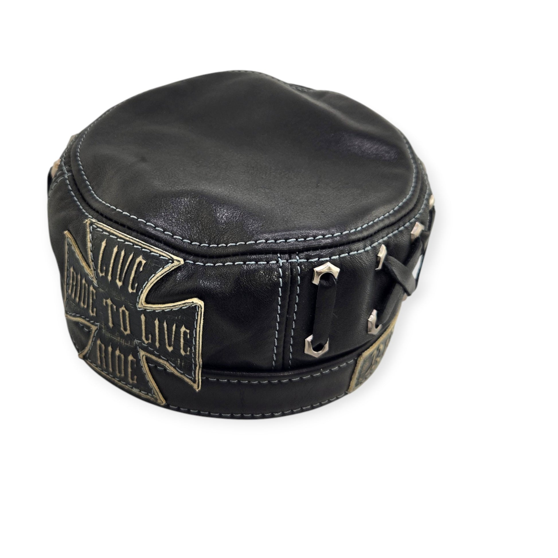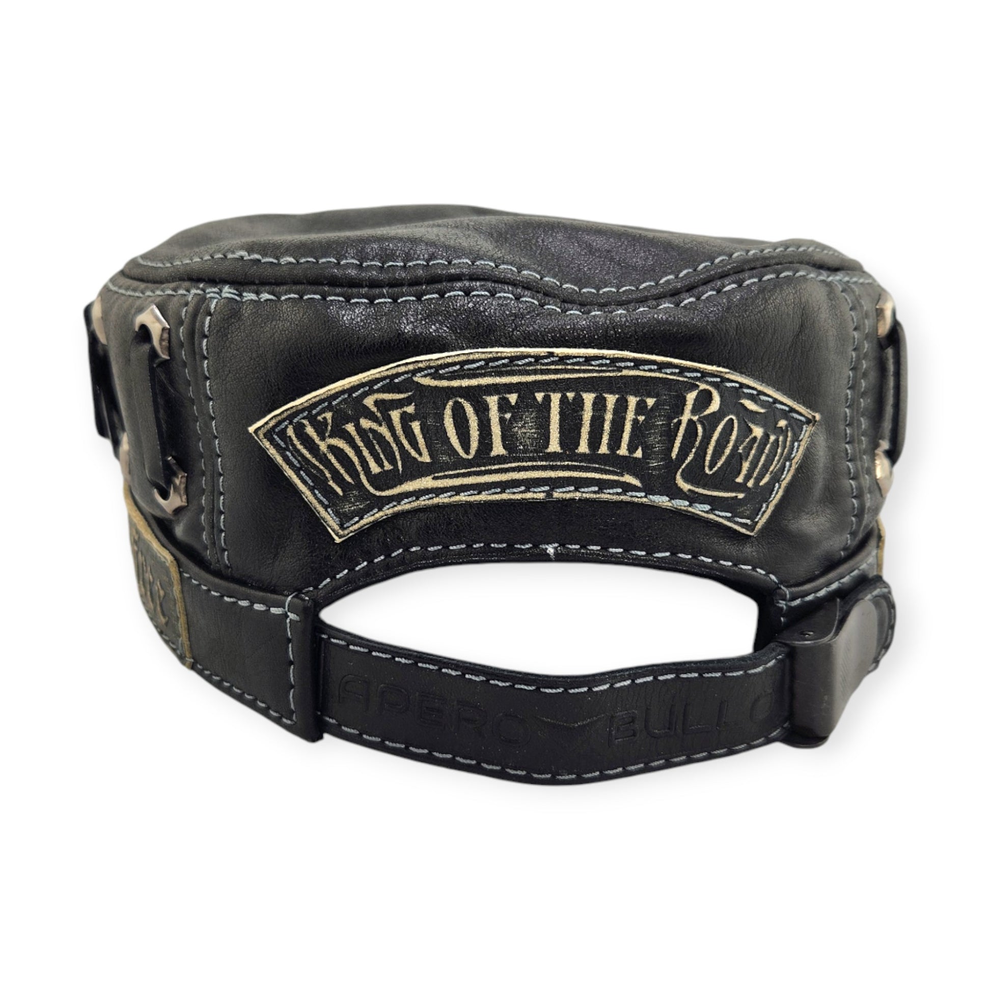 Leather Biker Hat: Handmade Black Motorcycle Cap with “Live to Ride, Ride to Live” Patch & King of the Road Motto | Apero Bullo