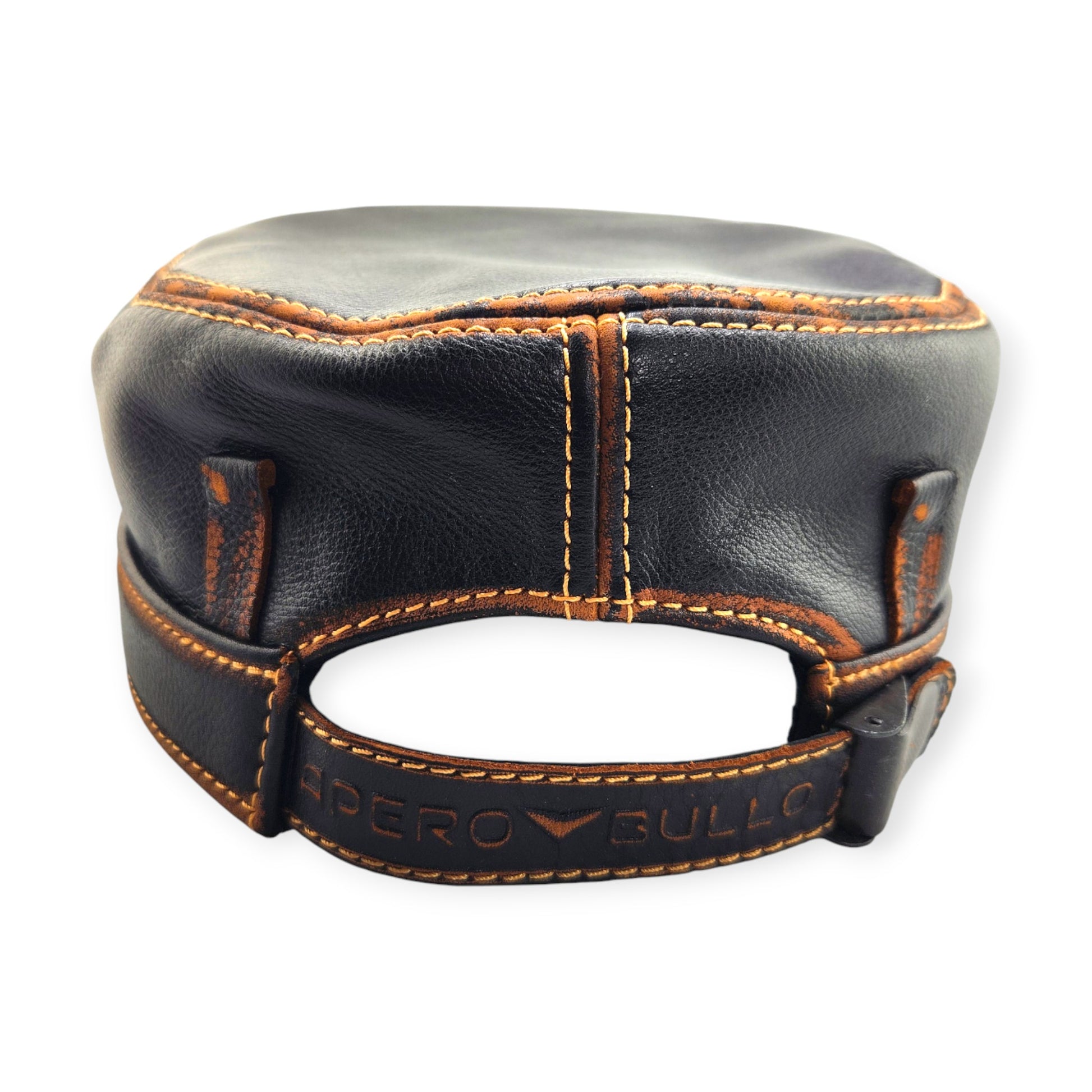 Leather Biker Hat – Handmade Black Distressed Military Cap with Skull & Rose Patch | Apero Bullo