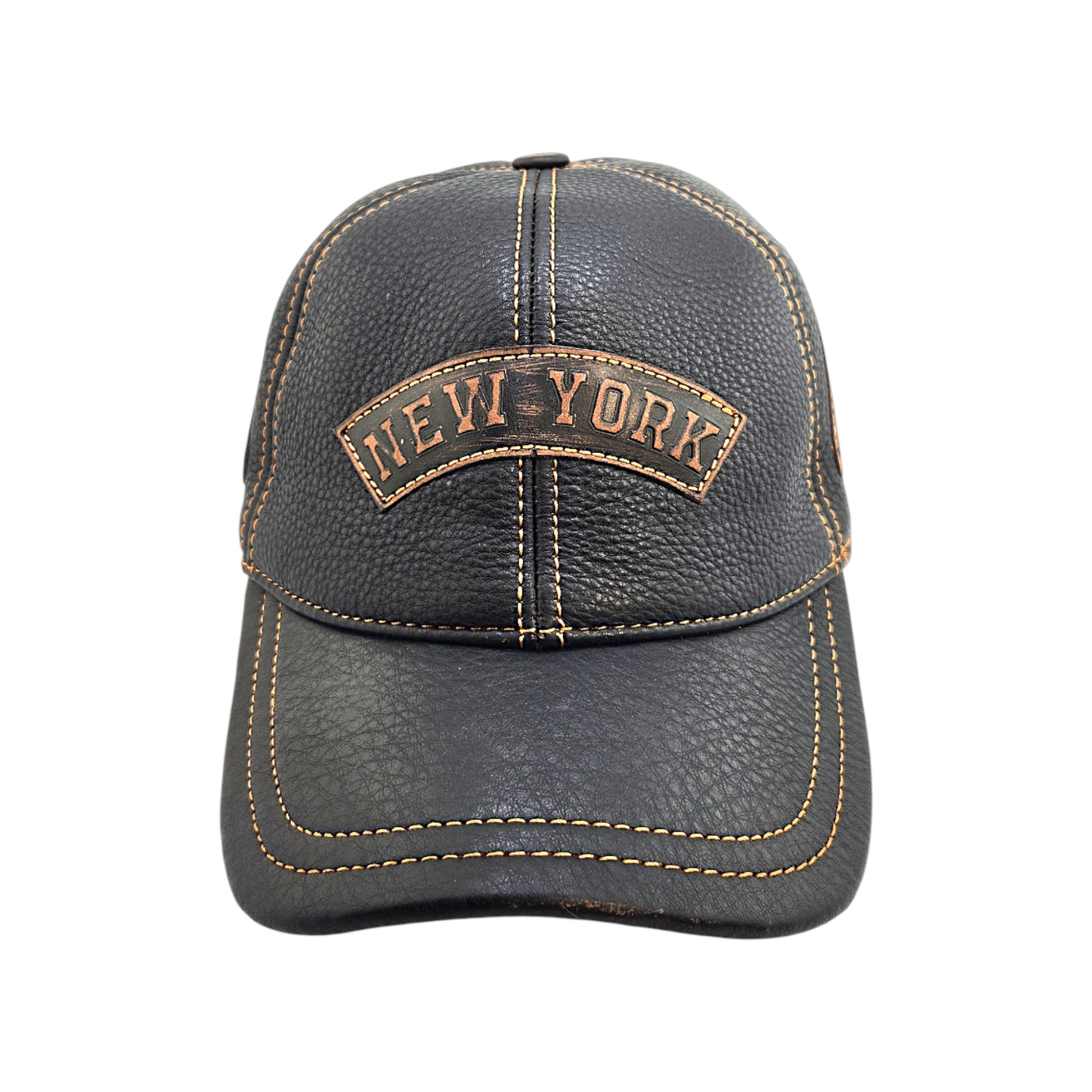 Leather Biker Hat: Handmade Black Motorcycle Cap with New York Patch, Distressed Leather and Adjustable Strap for Men | Apero Bullo