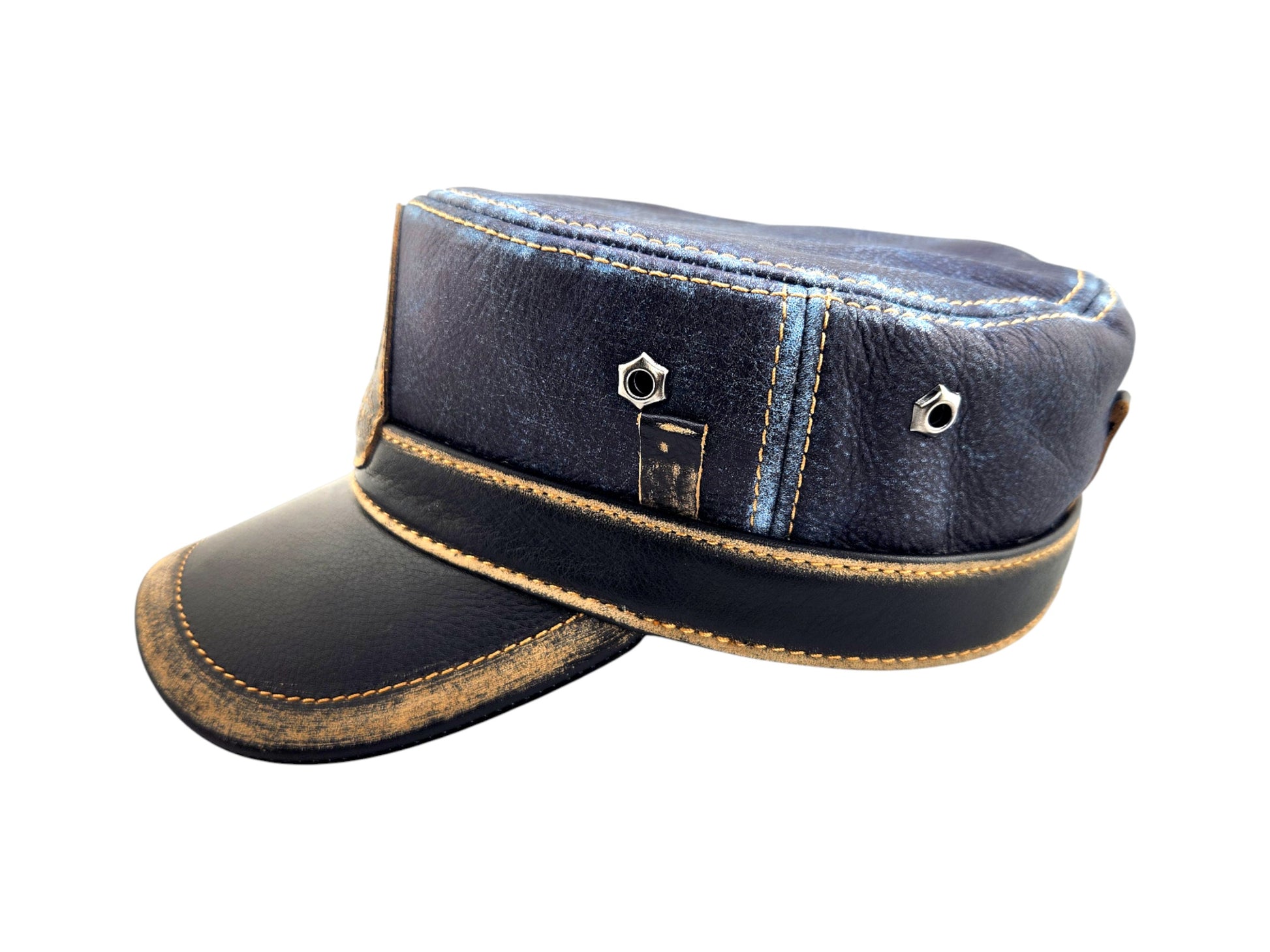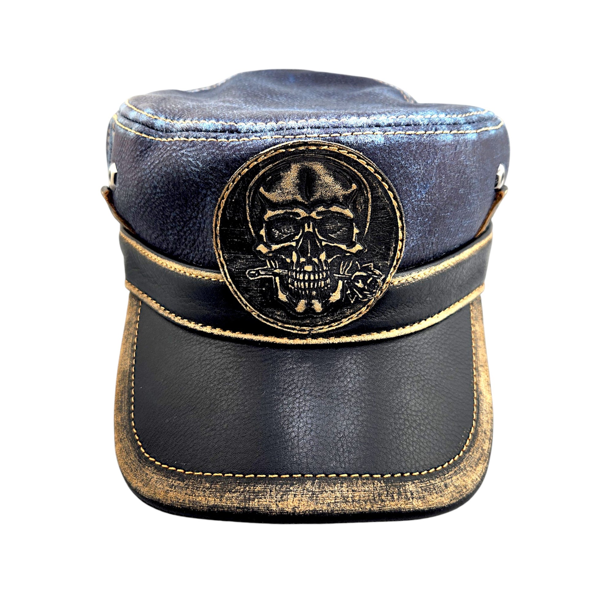 Leather Biker Hat – Handmade Distressed Military Cap with Skull Patch | Apero Bullo