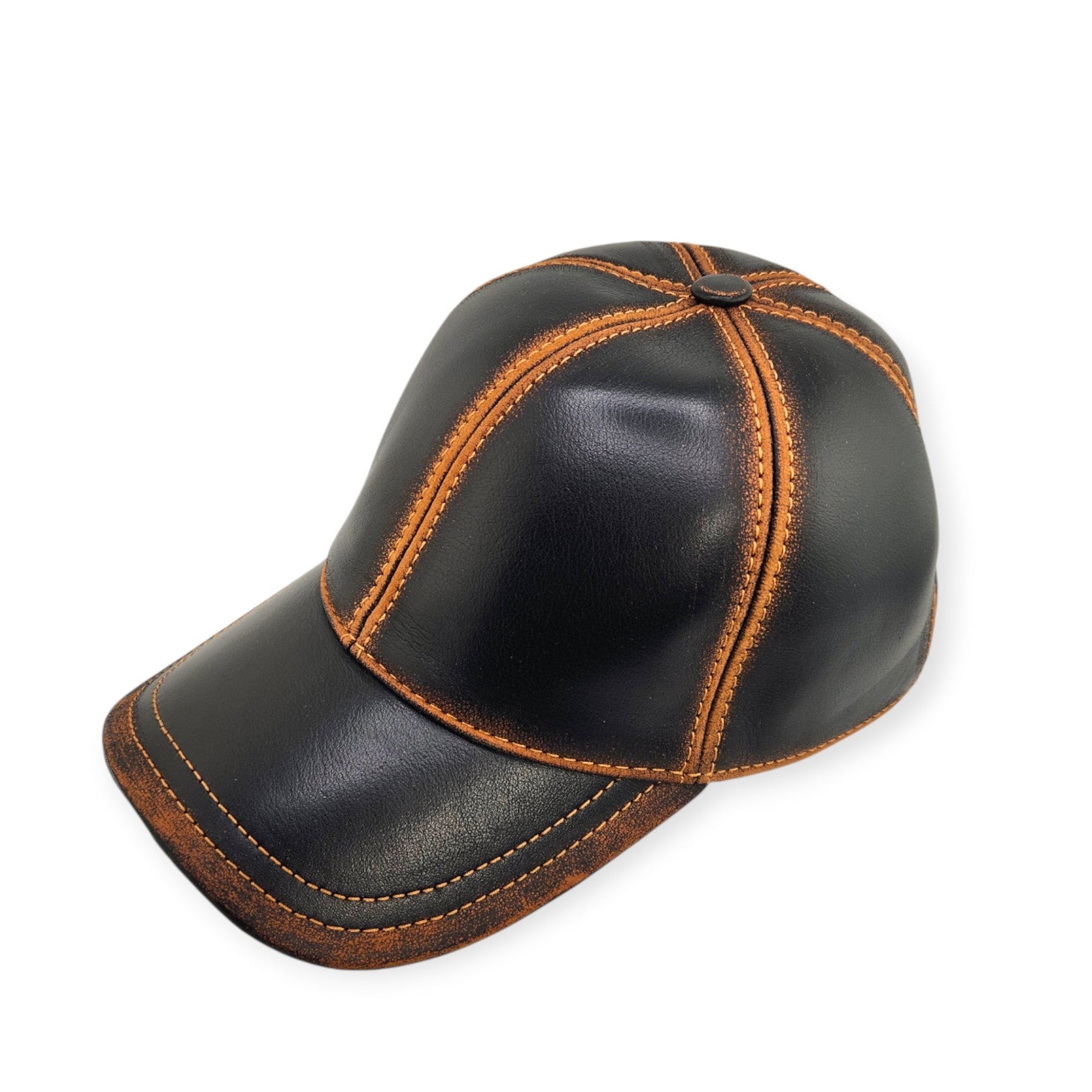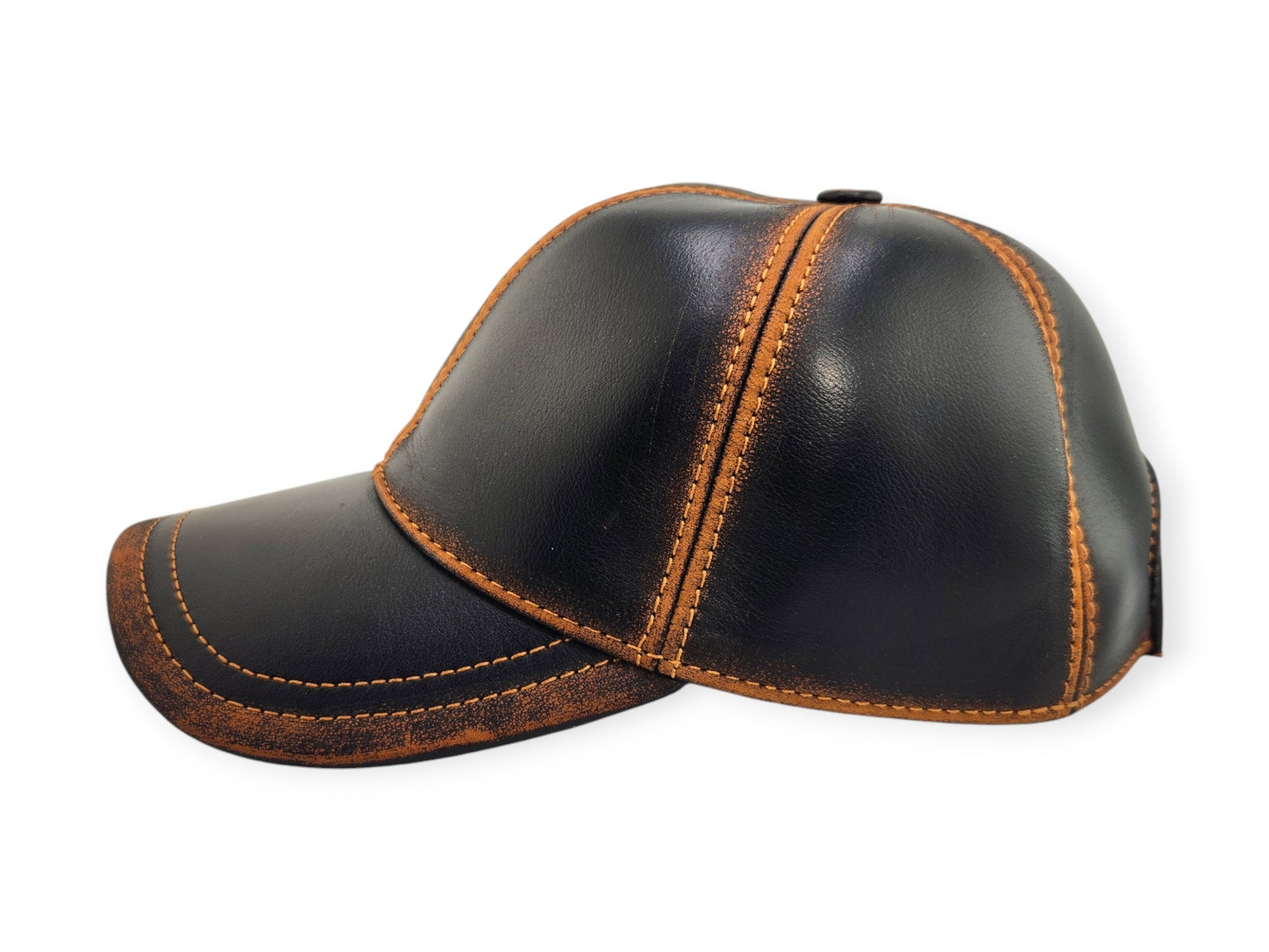 Leather Baseball Cap: Handmade Black & Brown Distressed Motorcycle Hat for Men with Vintage Stitching, Adjustable Strap | Apero Bullo
